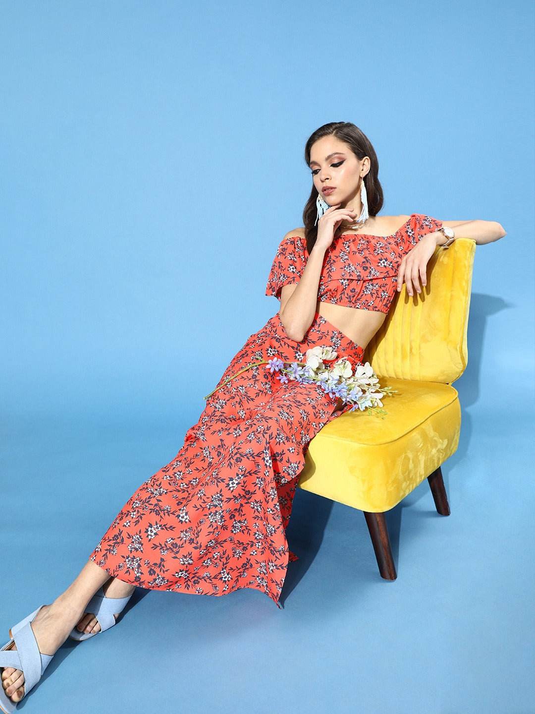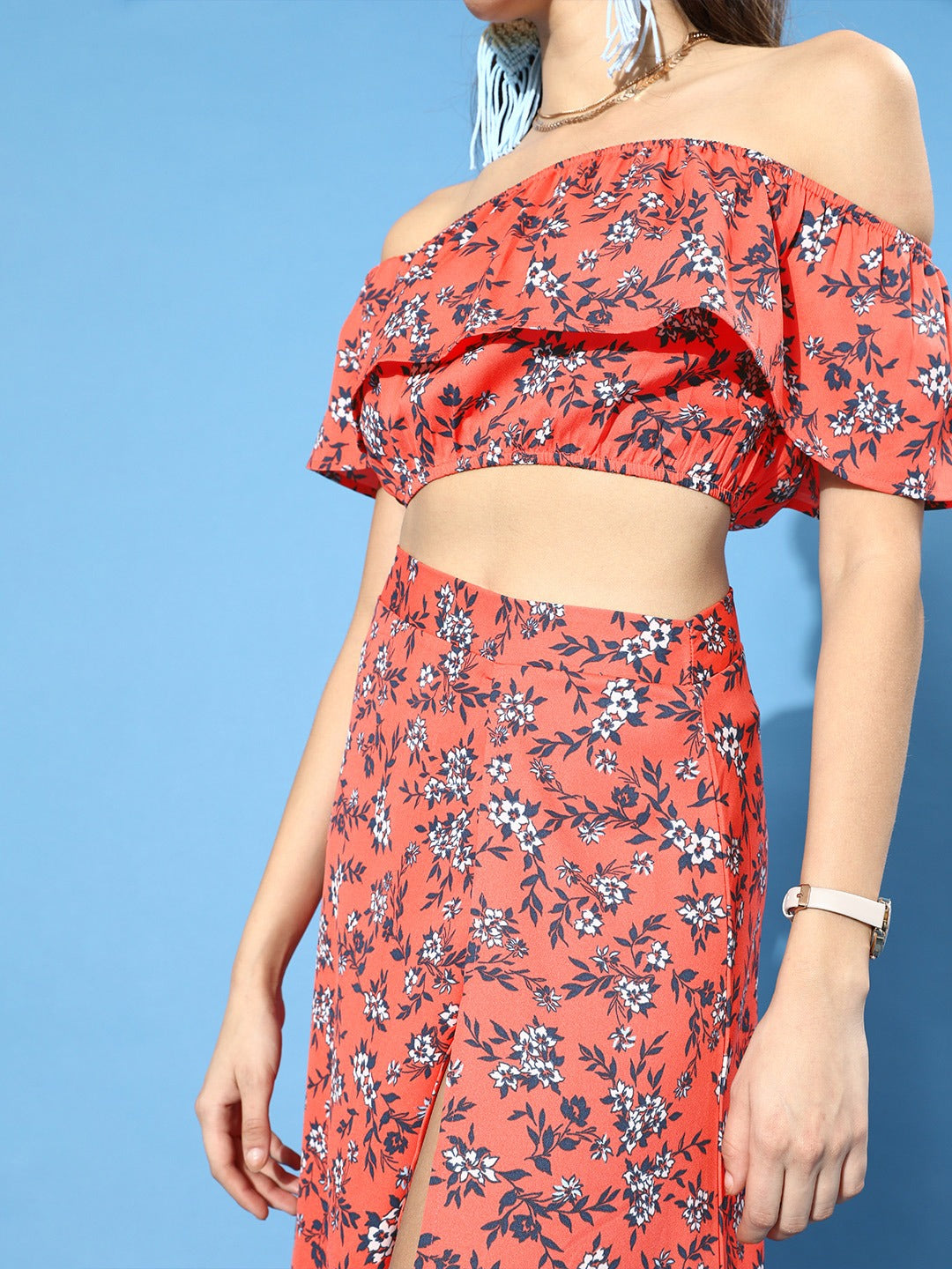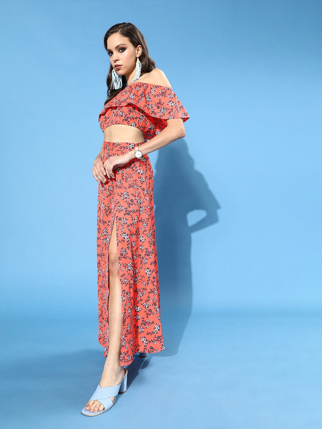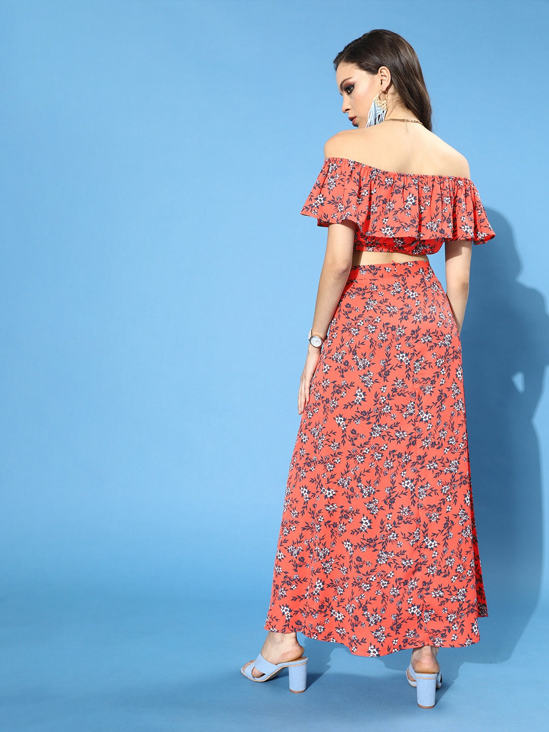 This sprint season embraces your love for a stylish and comfortable maxi dress with this magnetizing Orange Floral Printed Off-Shoulder Co-Ordinate Maxi Dress from the spring wear collection of Berrylush. Comprising of co-ordinate set of a crop top and maxi skirt to get you an antique and striking outlook. The off-the-shoulder neck design of the crop top gives away an alluring appearance by elegantly assembling your beautiful neckline features and the short cap sleeves get your arms an attractive appeal. Rendered from crepe polyester fabric to give the outfit a nice drape with anti-wrinkle attribute and the concealed zip closure provides an easy fastening process with the non-slip fit. The flared hemline with the front thigh slit of the maxi skirt creates an exotic look with a stylish finishing touch. You can pair up this charming maxi dress with block heels and a cute clutch to get a mesmerizing final look.