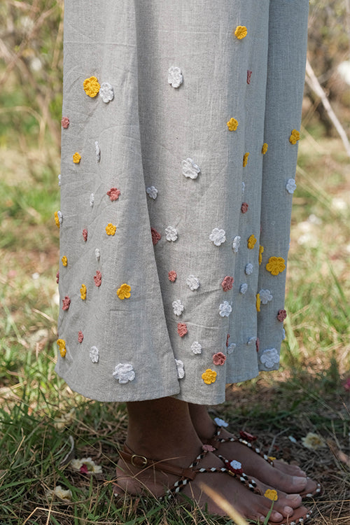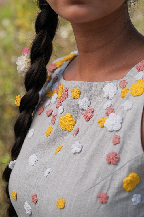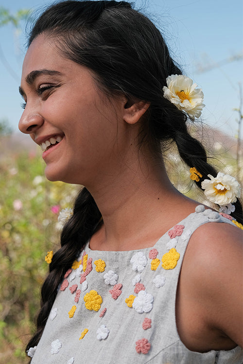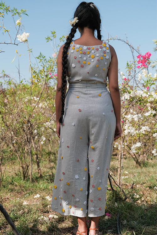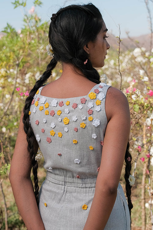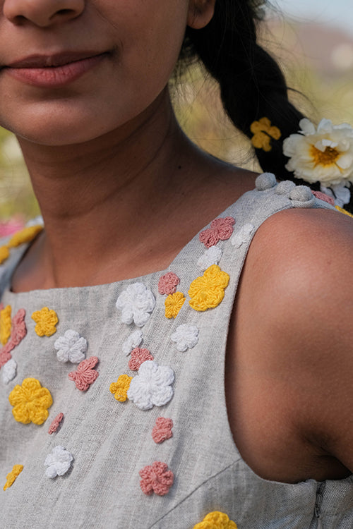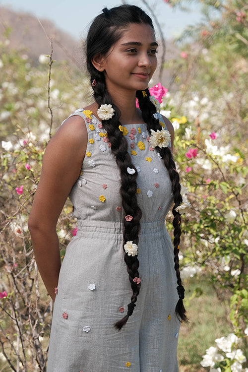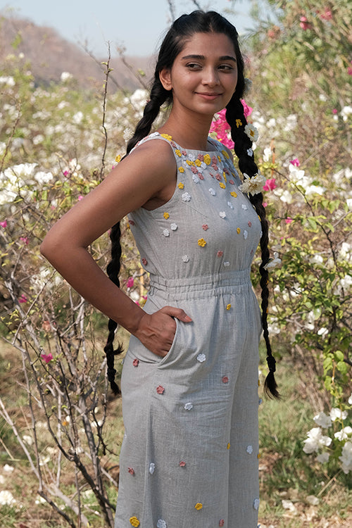 Get ready to take on summer in style with the ‘Holiday’ – a super fun grey jumpsuit that is excellent for all your summer adventures! Crafted from pure cotton, this jumpsuit is lightweight, breathable, and oh-so-comfortable, making it the perfect choice for those hot summer days. Featuring a sleeveless design and concealed zipper on the side, ‘Holiday’ is easy to wear and move in, making it perfect for everything from exploring new cities to lounging on the beach. The elastication on the waist provides a comfortable and flattering fit, while the two pockets add a touch of practicality to the jumpsuit. The real showstopper of the garment is the delicate flowers made from cotton thread using a hand crochet technique. In shades of pink, white, and yellow, these flowers adorn the front, back, and bottom part of the jumpsuit, adding a playful and whimsical touch to the overall design. But ‘Holiday’ isn’t just about style – it’s also incredibly versatile. The jumpsuit’s grey color makes it easy to pair with different accessories and shoes, while the jumpsuit style allows you to move and explore without any restrictions. Whether you’re attending a summer wedding, going on a beach vacation, or simply enjoying a day out with friends, the ‘Holiday’ is the perfect choice for a fun and comfy summer look. So why wait? Add this beautiful jumpsuit to your wardrobe today and get ready to make memories that will last a lifetime!