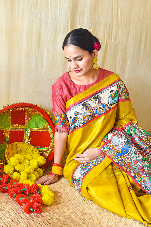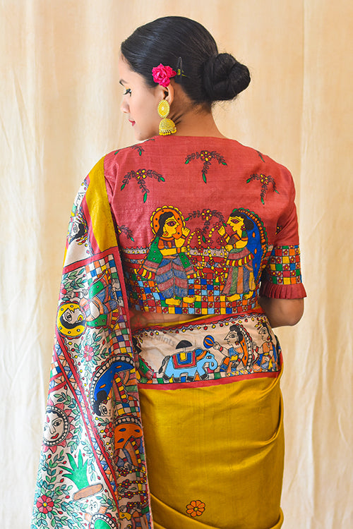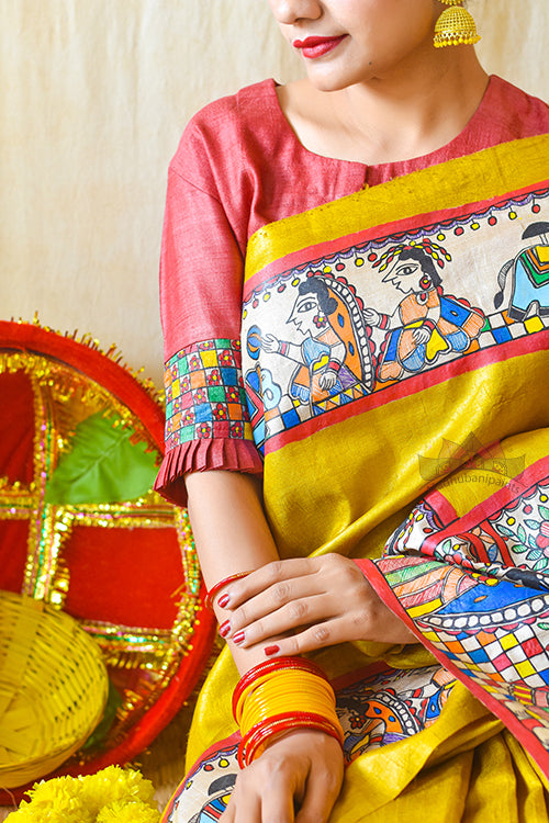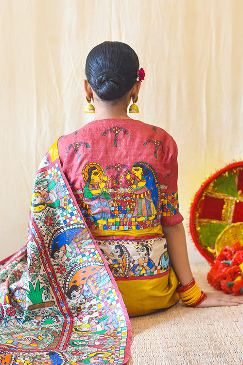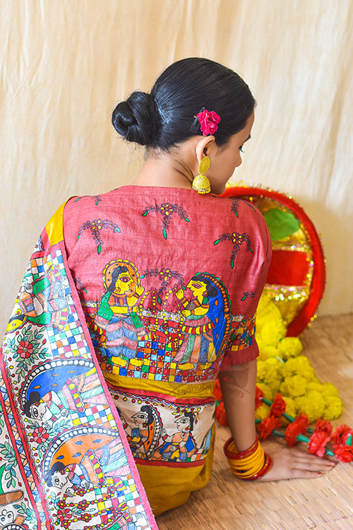 Authentic Handpainted Madhubani Handwoven blouse in Tussar SIlk. Back of this blouse has a depiction of grand swayambar, where bride and groom are holding varnmala in their hands. check borders are highlight of this blouse, heavily depicted on the back and sleeves. This round neck blouse has front opening Made on order, Blouse will be dispatched in a maximum of 20-25 days