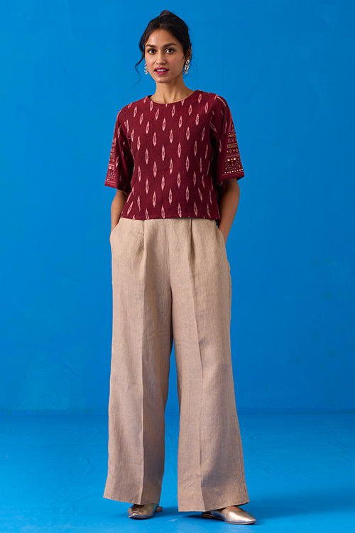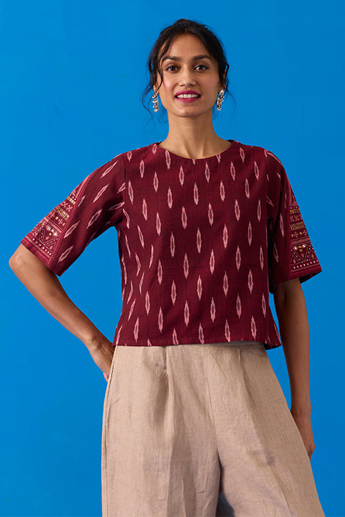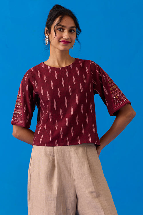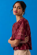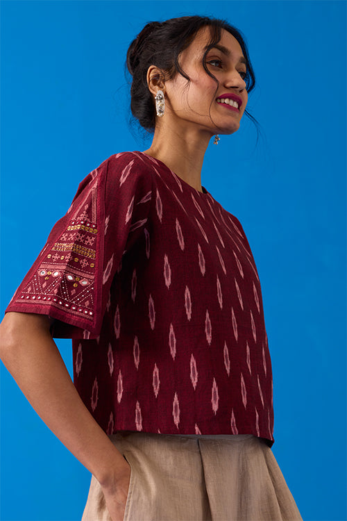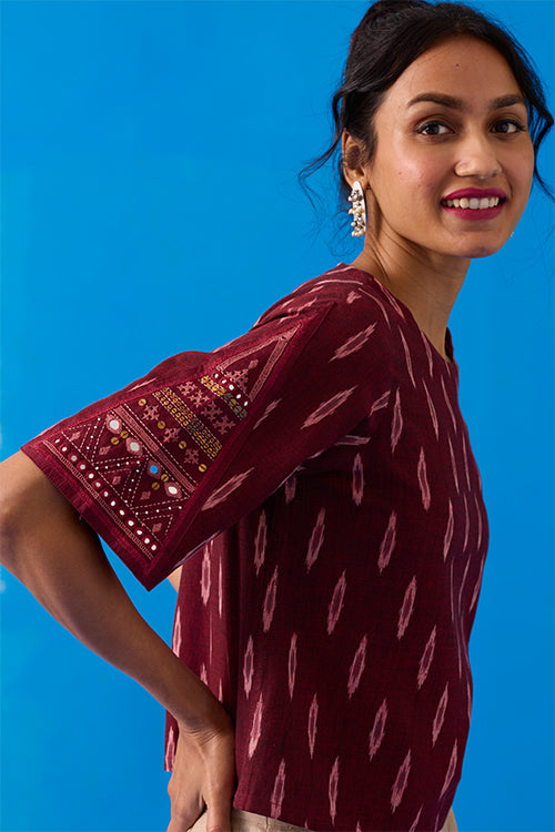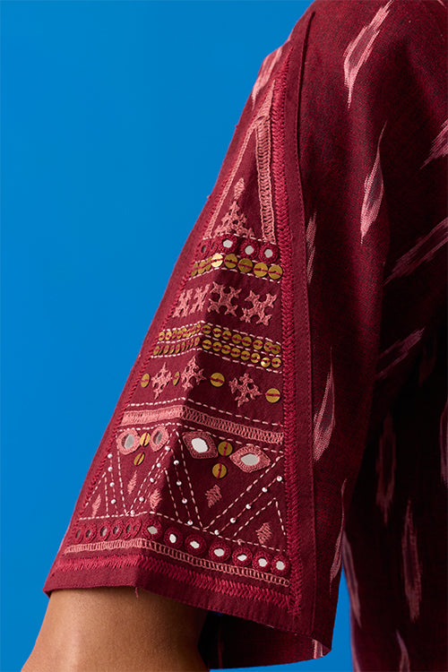 Inspired by the sun’s brilliance, the “Konark Sun” Top radiates intricate beauty. Crafted from maroon Ikkat, this piece features striking triangular embroidered patches on the sleeves, adorned with satin, running, and Bavadiyo stitches. Golden tikkis, white glass beads, and reflective mirrors bring a subtle glow to every detail. The back closure, finished with a single button, adds to the refined simplicity. Pair it with tailored trousers or a breezy skirt, letting the rich embroidery and vibrant colors take center stage in your look.