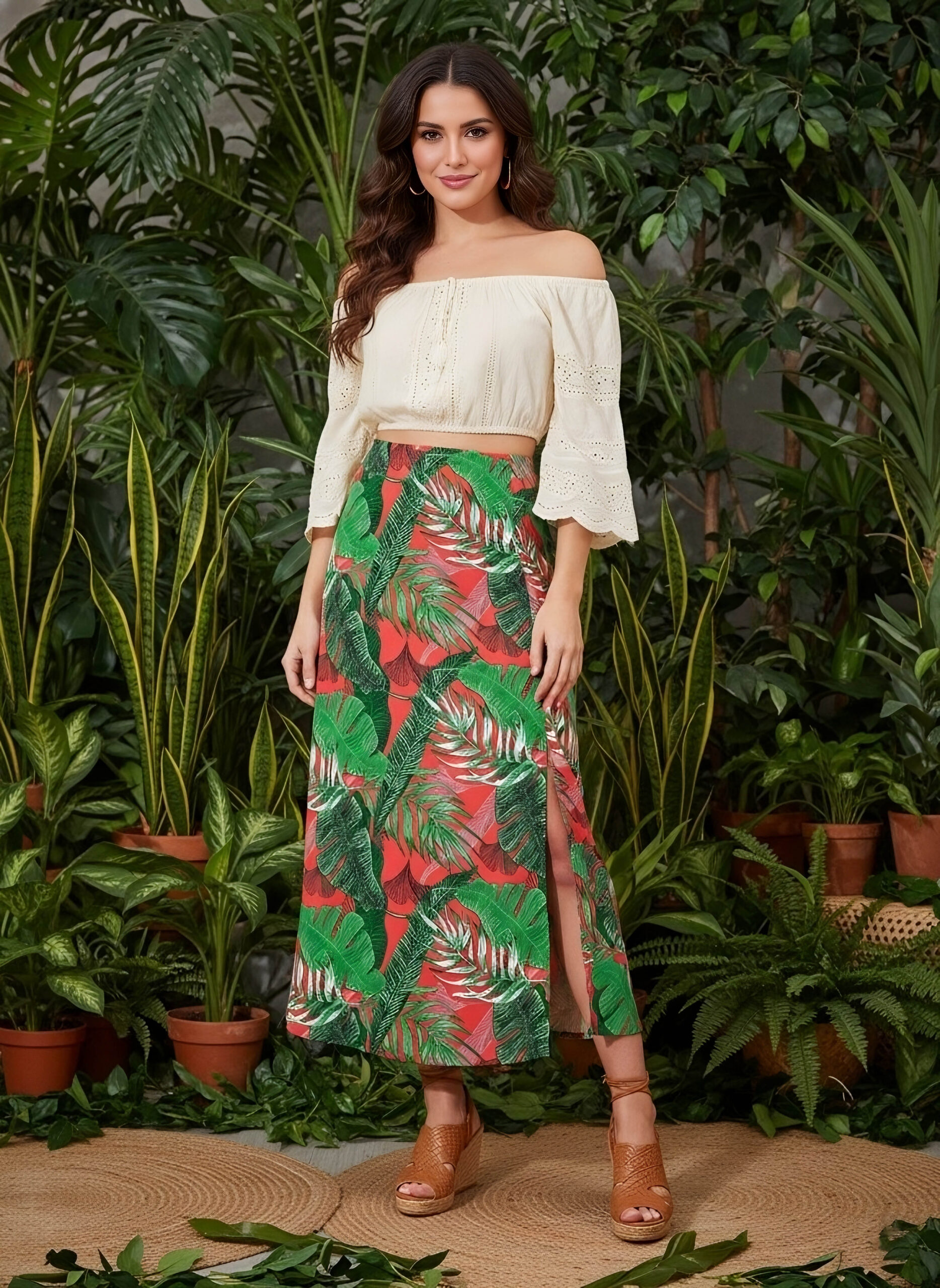Introducing Berrylush’s latest masterpiece – the Red & Green Tropical Printed High-Rise Waist Straight Hem Thigh-High Slit A-Line Maxi Skirt. Embrace your love for vivid colours and daring designs with this eye-catching piece, perfect for any travel occasion. Crafted from luxurious polyester fabric, it offers a comfortable fit that moves with you. The high-rise waist accentuates your curves leading down to a gracefully straight hemline enhanced by a thigh-high slit, adding an element of allure to every step you take. The tropical print bursts in shades of red and green, capturing the essence of exotic destinations. This woven skirt is finished with an opaque look and secures effortlessly at the side with a zipper closure – embodying elegance and adventure in every detail.